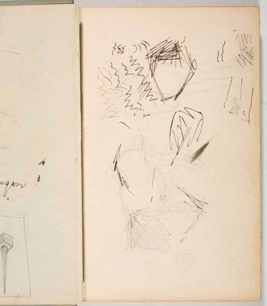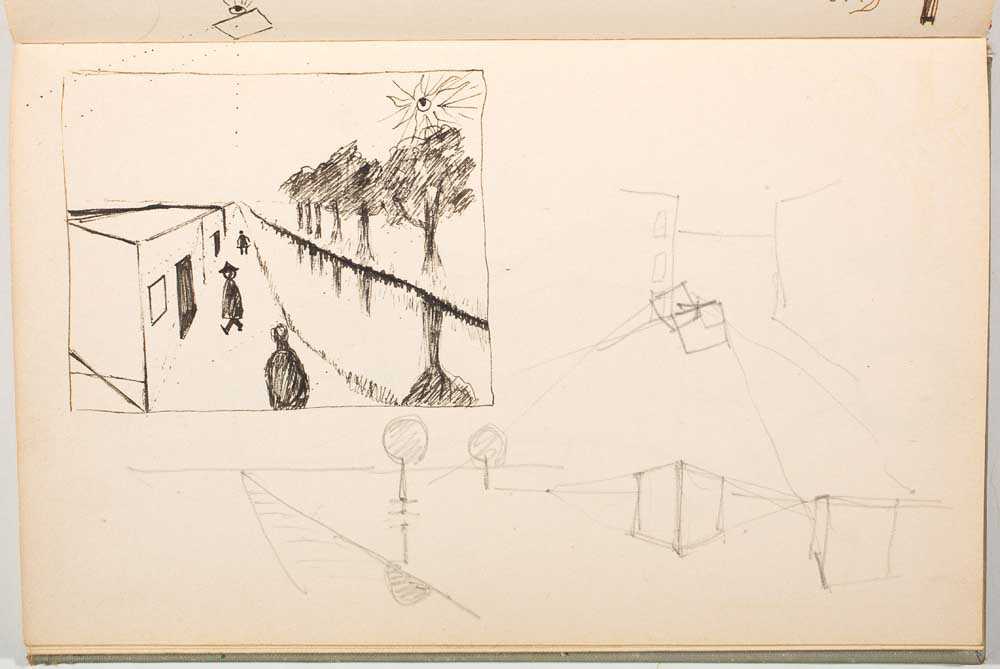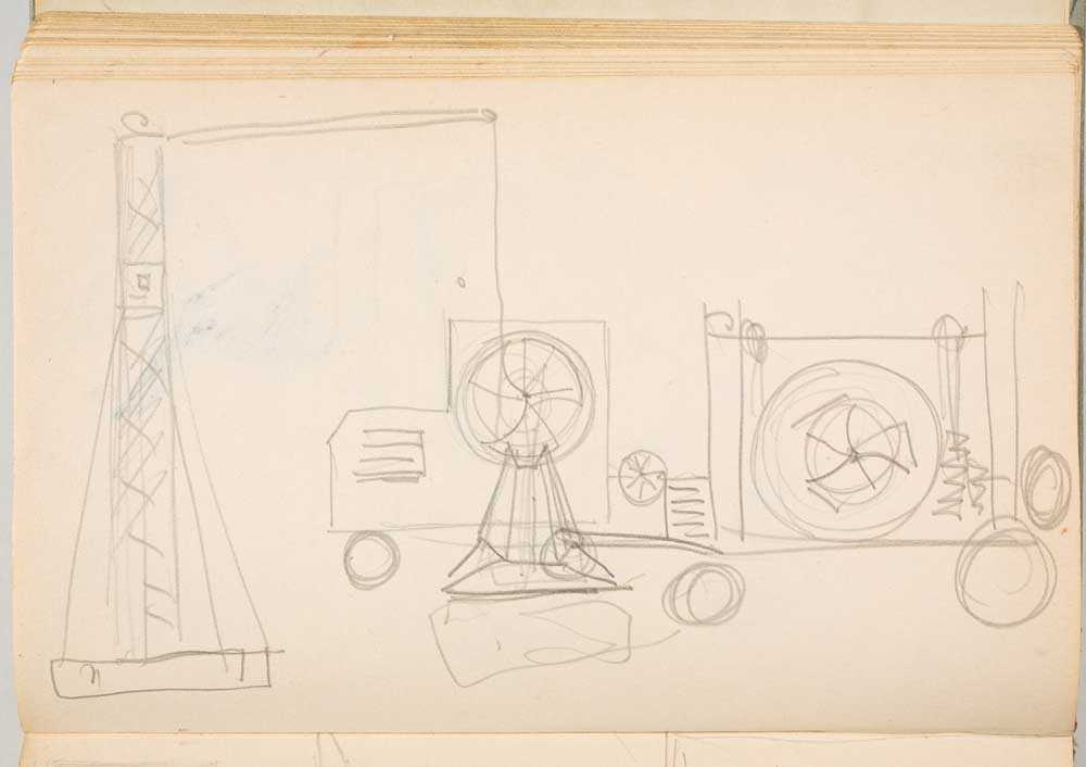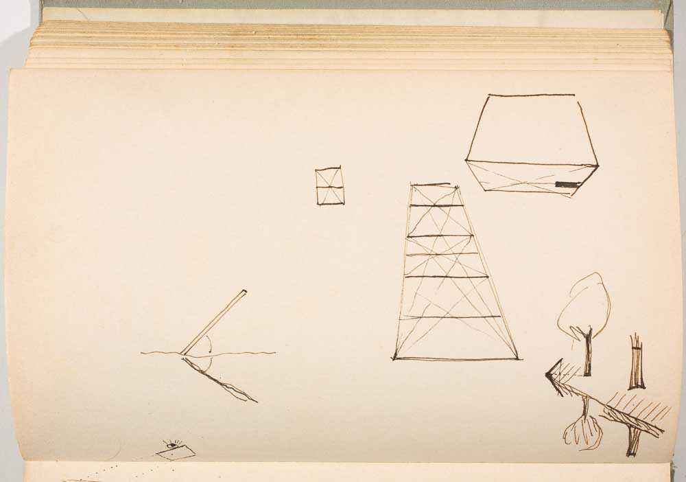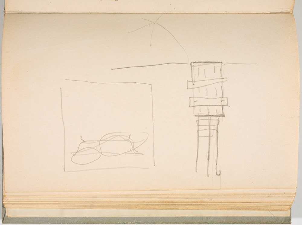 Sheet 004 A study in black pencil of an easel. Above that a view through a structure, looking at an unrecognizable scene. Above that again a bird drying its feathers..