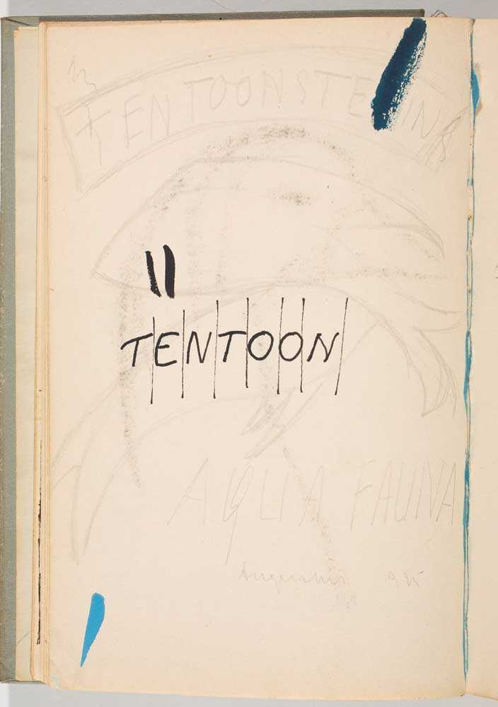 Schutblad. Het is door Idonia gebruikt om een soort palet van plakkaatverf te bouwen. Ook maakte ze een ander ontwerp voor een ets in een kader en wat onderdelen voor een ontwerp.