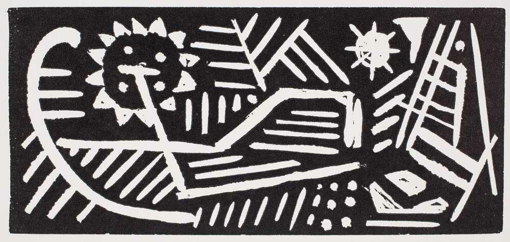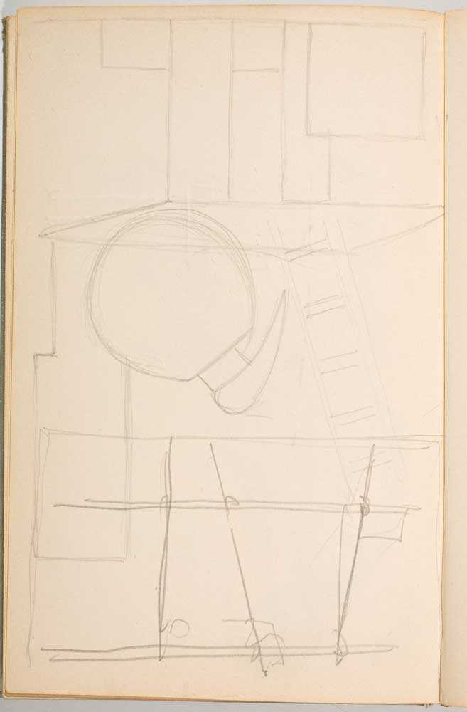 Sheet 007 reverse. Design of an etching in detail. Plus a depiction of someone standing on a pile of pillows on the bed and looking through the ceiling (out?).