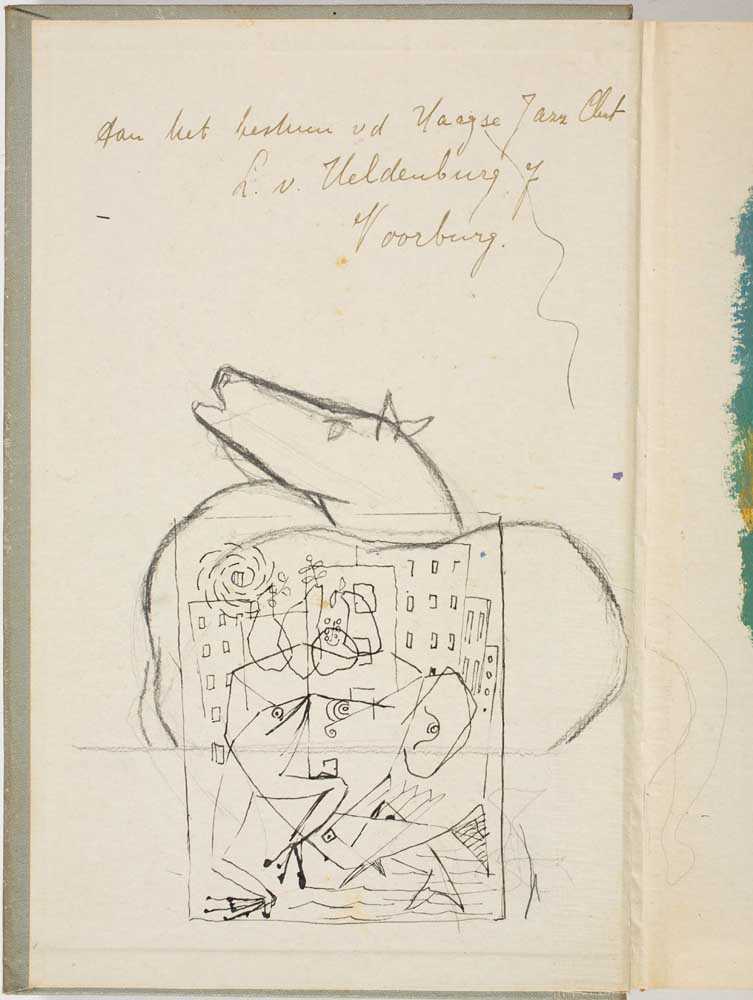 Blad 11 achterzijde. Potloodtekening van een paard en kar van een schelpenvisser op het strand van Scheveningen en een snel schetsje, daardoorheen, in inkt, een variant op het ontwerp op de voorkant van blad 11.