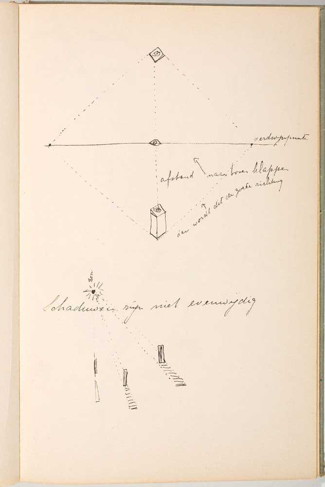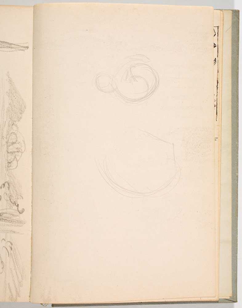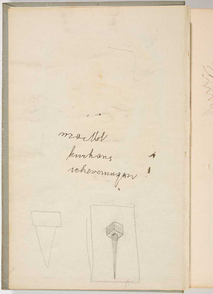 Achterkant schutblad. De tekst is niet in Idonia's handschrift, waarschijnlijk heeft iemand dit genoteerd voor Idonia. Twee kleine studies van een onderdeel.