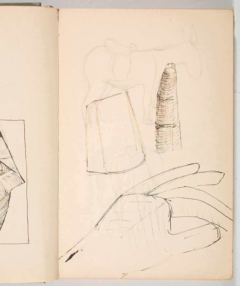 Blad 002 Twee andere potloodstudies van een ezel op het Scheveningse strand, een inktstudie van een vinger met lange nagel, mogelijk Idonia's eigen vinger, en een studie van een hand, in perspectief.