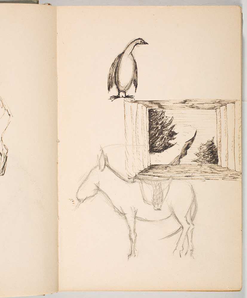 Blad 004 Een studie in zwart potlood van een ezel. Daarboven een doorkijk door een bouwsel heen, kijkend naar een onherkenbare voorstelling. Daarboven weer een vogel die zijn veren laat drogen.