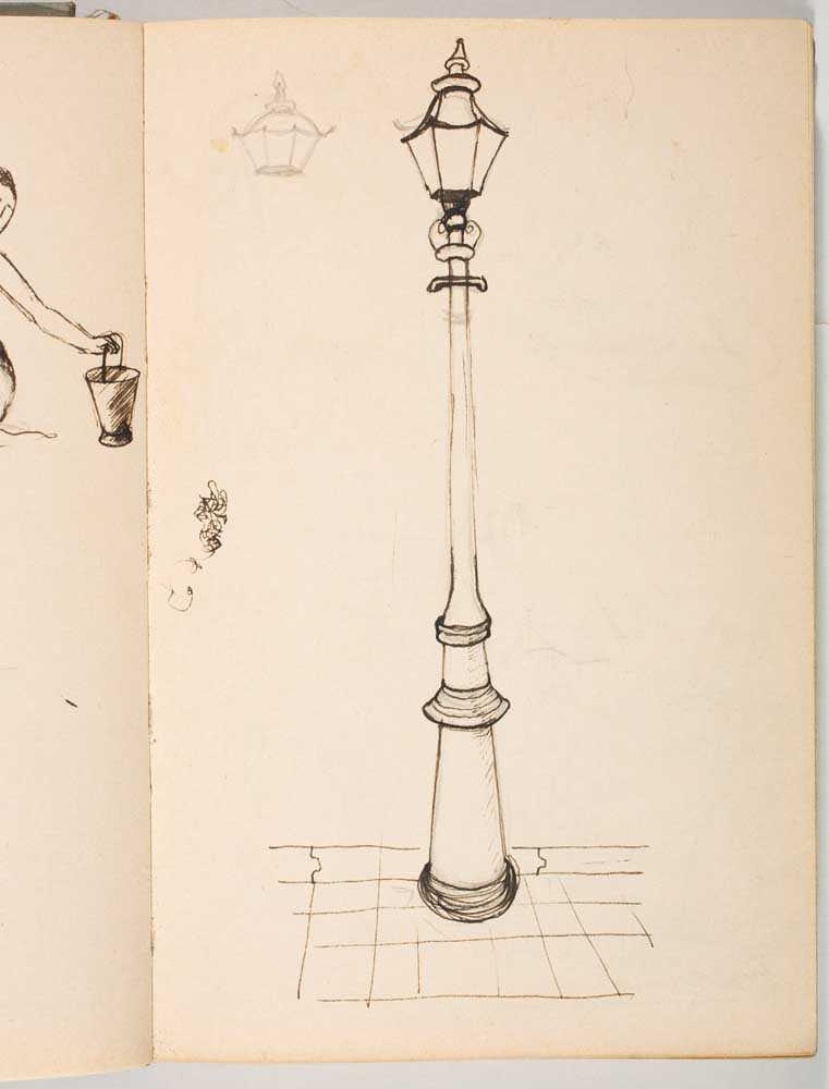 Blad 007. Studie in inkt van een straatlantaarnpaal.