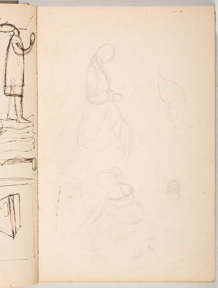 Sheet 002 Two other pencil studies of an easel on the Scheveningen beach, an ink study of a finger with a long nail, possibly Idonia's own finger, and a study of a hand, in perspective.