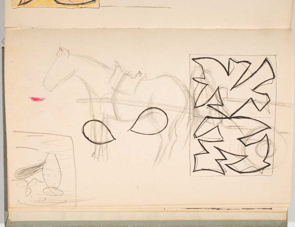 Sheet 11 reverse. Pencil drawing of a shell fisherman's horse and cart on the beach at Scheveningen and a quick sketch, through it, in ink, a variation of the design on the front of sheet 11.