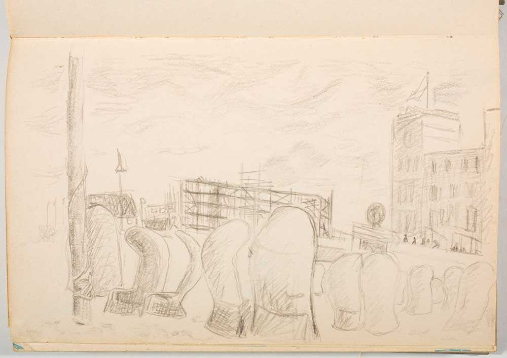 Blad 84. Doorkijkje naar haven. Ik weet niet waar deze tekening gemaakt is, ik herinner me de Scheveningse binnenhavens niet op deze manier. Achterzijde leeg.