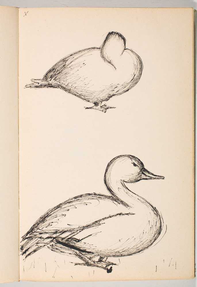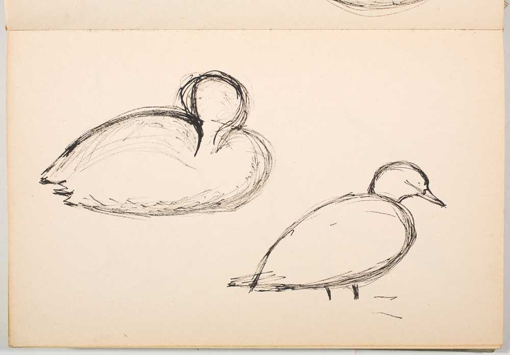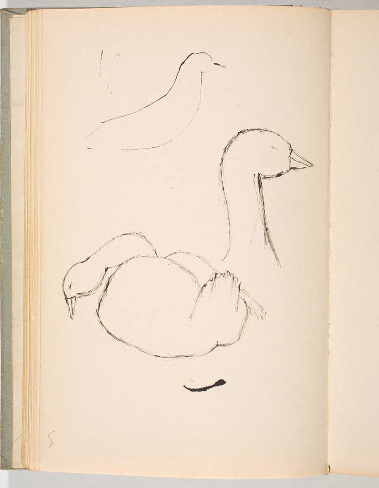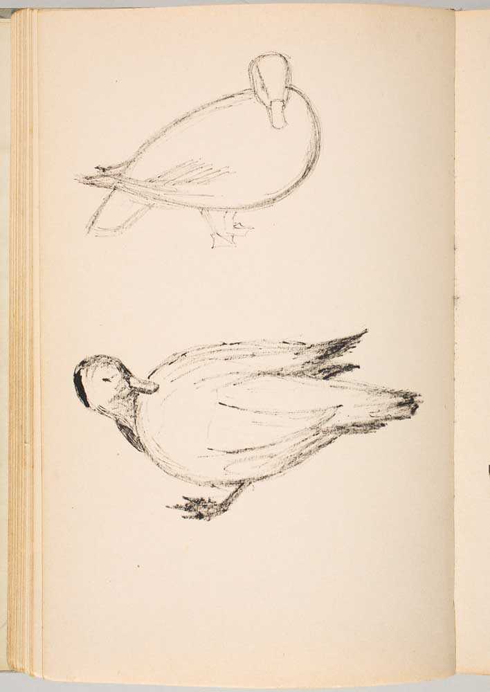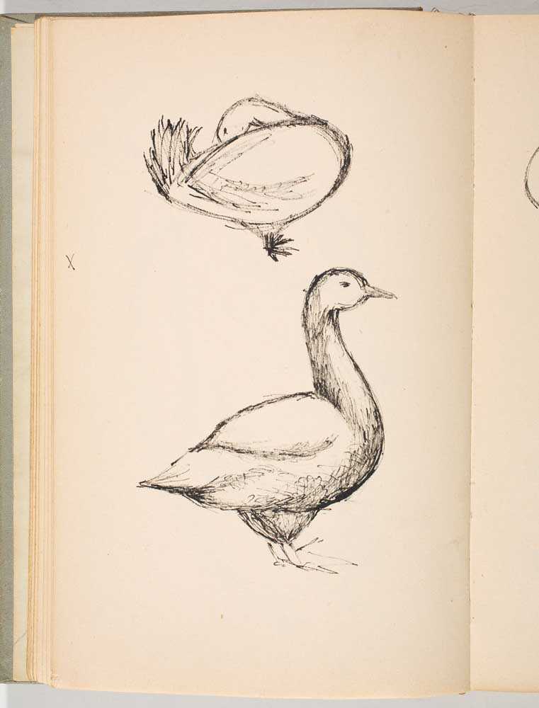 Blad 15 achterzijde. Twee schetsen van een vogel die bezig is de veren op zijn rug schoon te maken