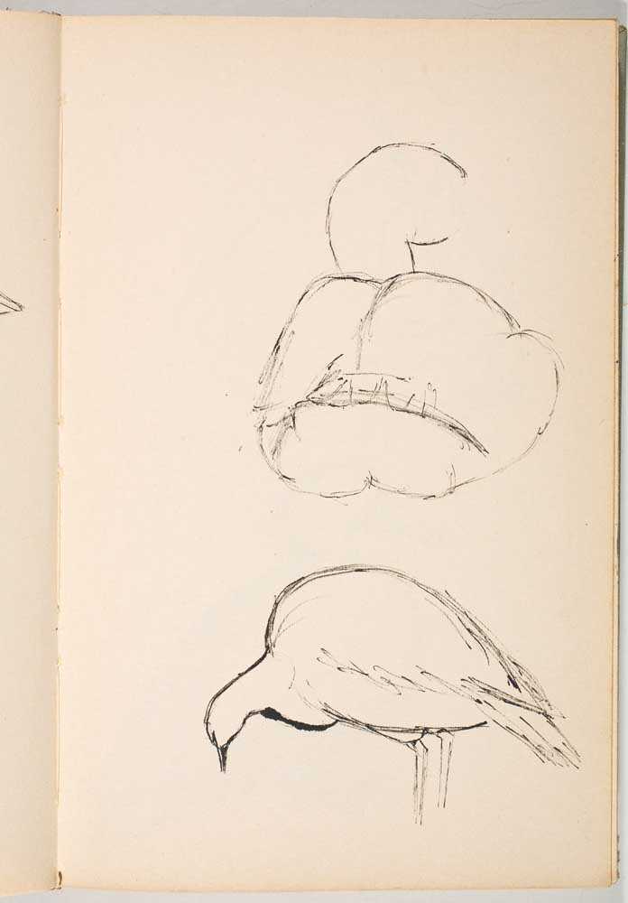 Sheet 15 back. Two sketches of a bird busy cleaning the feathers on its back