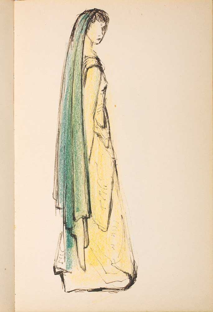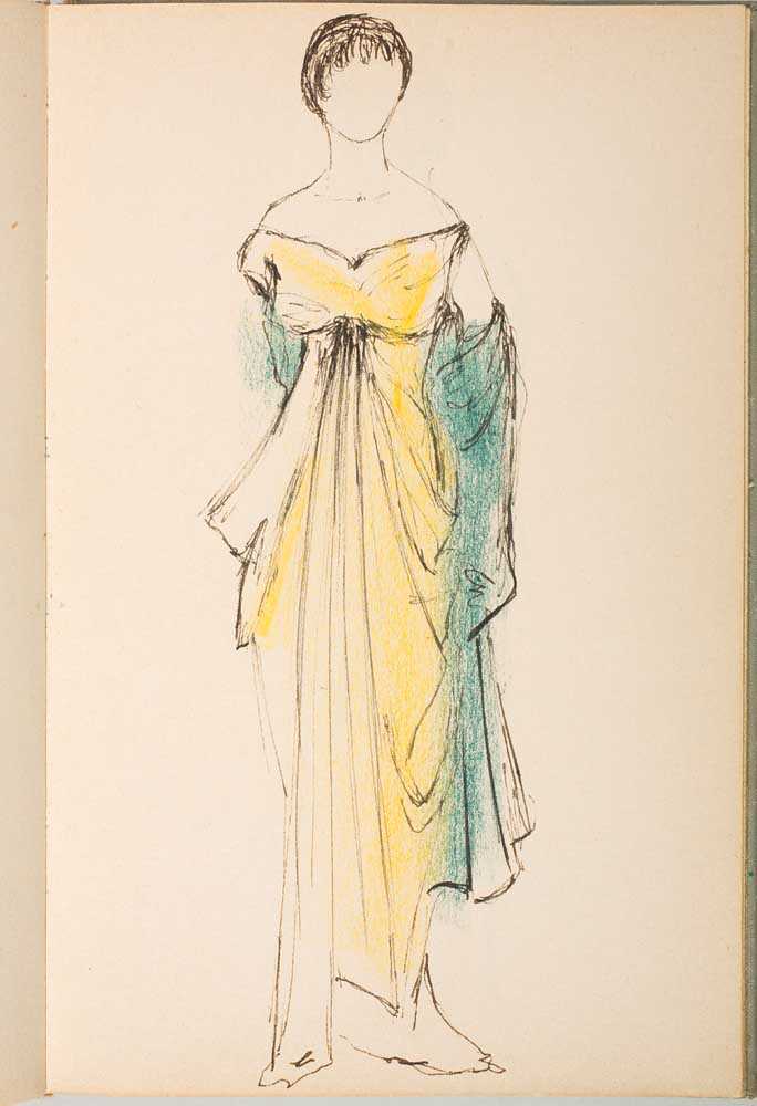 Sheet 93. Female model in yellow evening gown with green veil as drag. Back blank.
