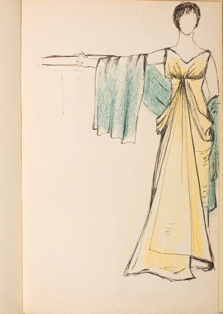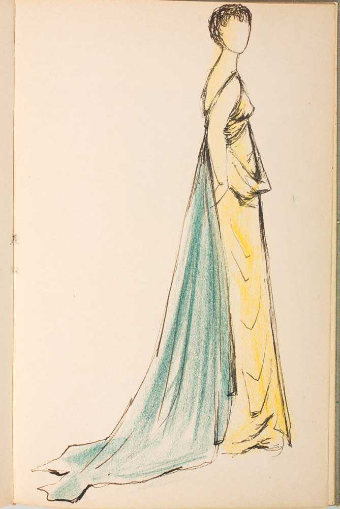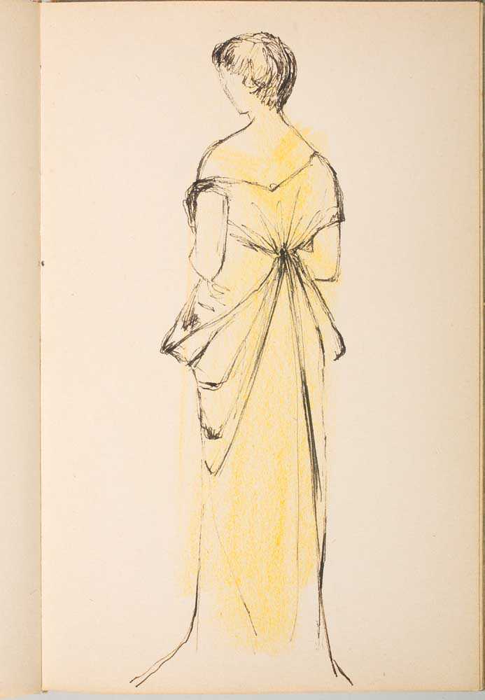 Sheet 89. Female model in yellow evening gown with green veil as shawl. Back blank.