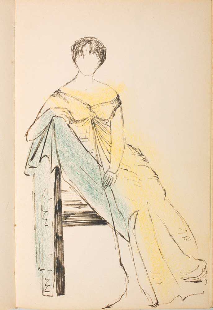 Sheet 92. Female model in yellow evening gown with green shawl, seated on chair. Back blank.