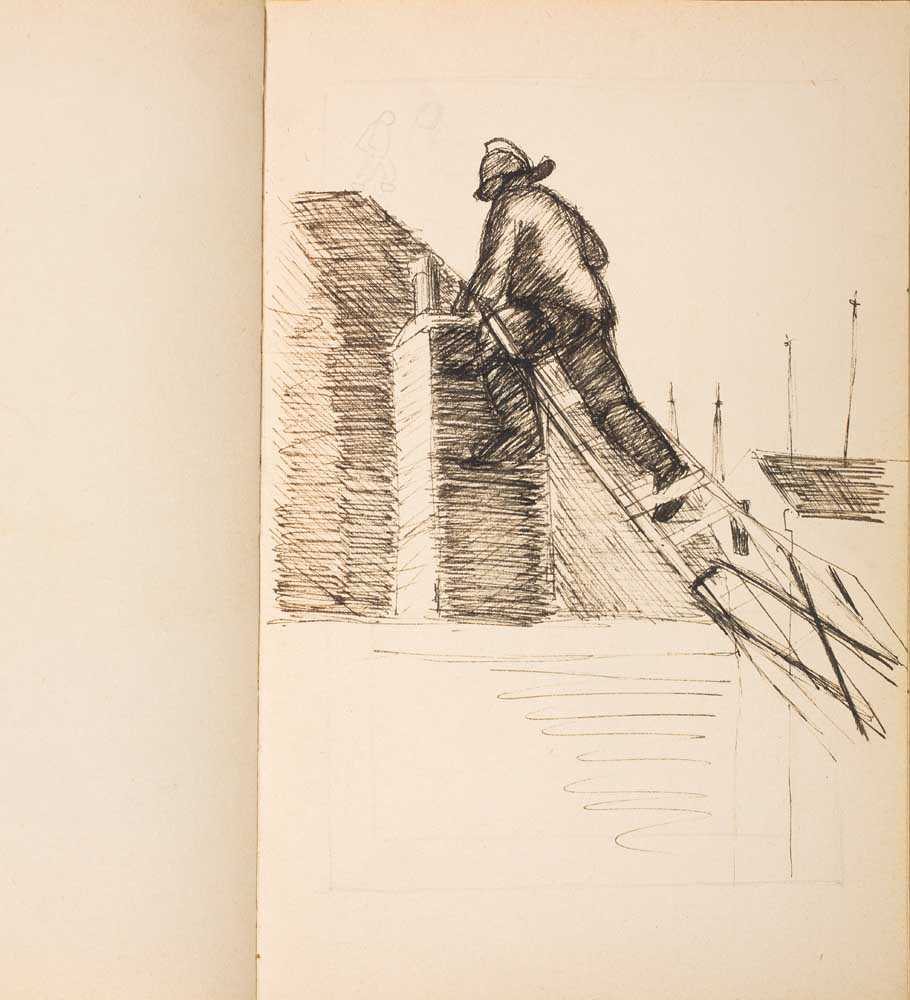 Sheet 102. Firefighter puts out chimney fire Column Street, the first old house next to Thabur's parking lot. The front of the house is visible in photo 1433, sheet 5 of sketchbook 3. The building was the home of a lore merchant who lived and worked there. Back blank.