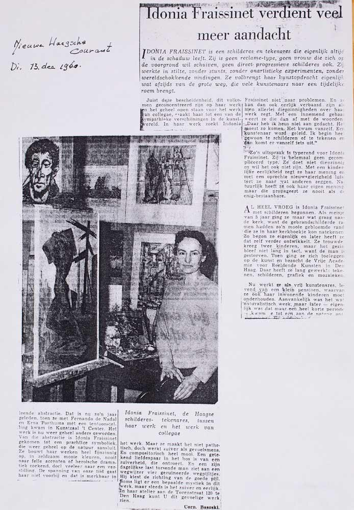 Hij schrijft:... en als er op deze tentoonstelling te ontdekken is dan is het misschien wel bij Idonia L. Fraissinet die met twee schilderijen verrassend knap werk leverde, knap in compositie, in kleurstellingen en in materiaalbehandeling. De verlatenheid van het strand is zeer suggestief verbeeld en de huizen bij Kijkduin getuigen van een zeer persoonlijk plastisch beleven.